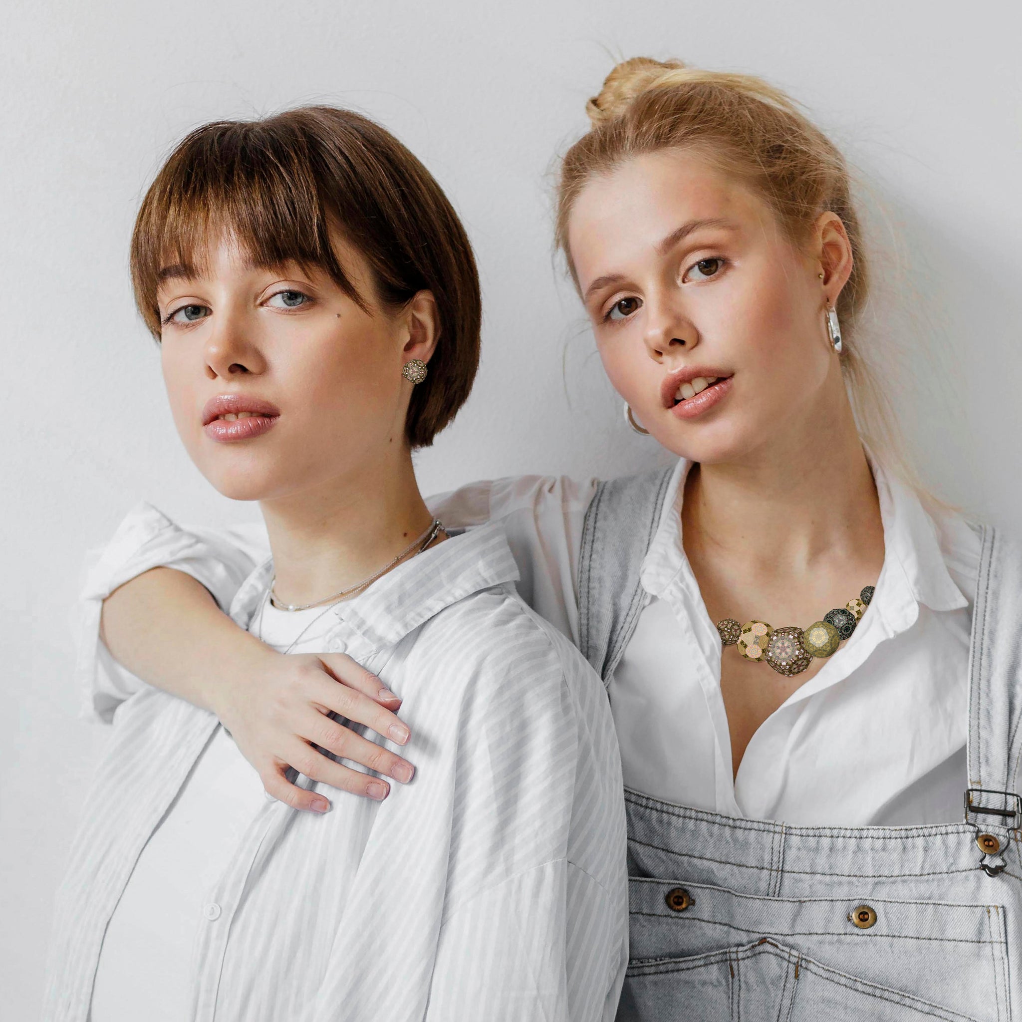 Cosmic Egyptian is a jewellery collection that channels the glamour of ancient queens and the glow of distant galaxies. Laser-cut wooden forms are paired with gold and brass-toned beads, evoking scarabs, suns, and sacred geometry—filtered through a queer, cosmic lens. Think Cleopatra meets Ziggy Stardust, or a nonbinary high priestess on a desert moon. These pieces shimmer with symbolism: power, transformation, ritual, and radiant self-expression. Perfect for adorning your inner deity—or outer alien.